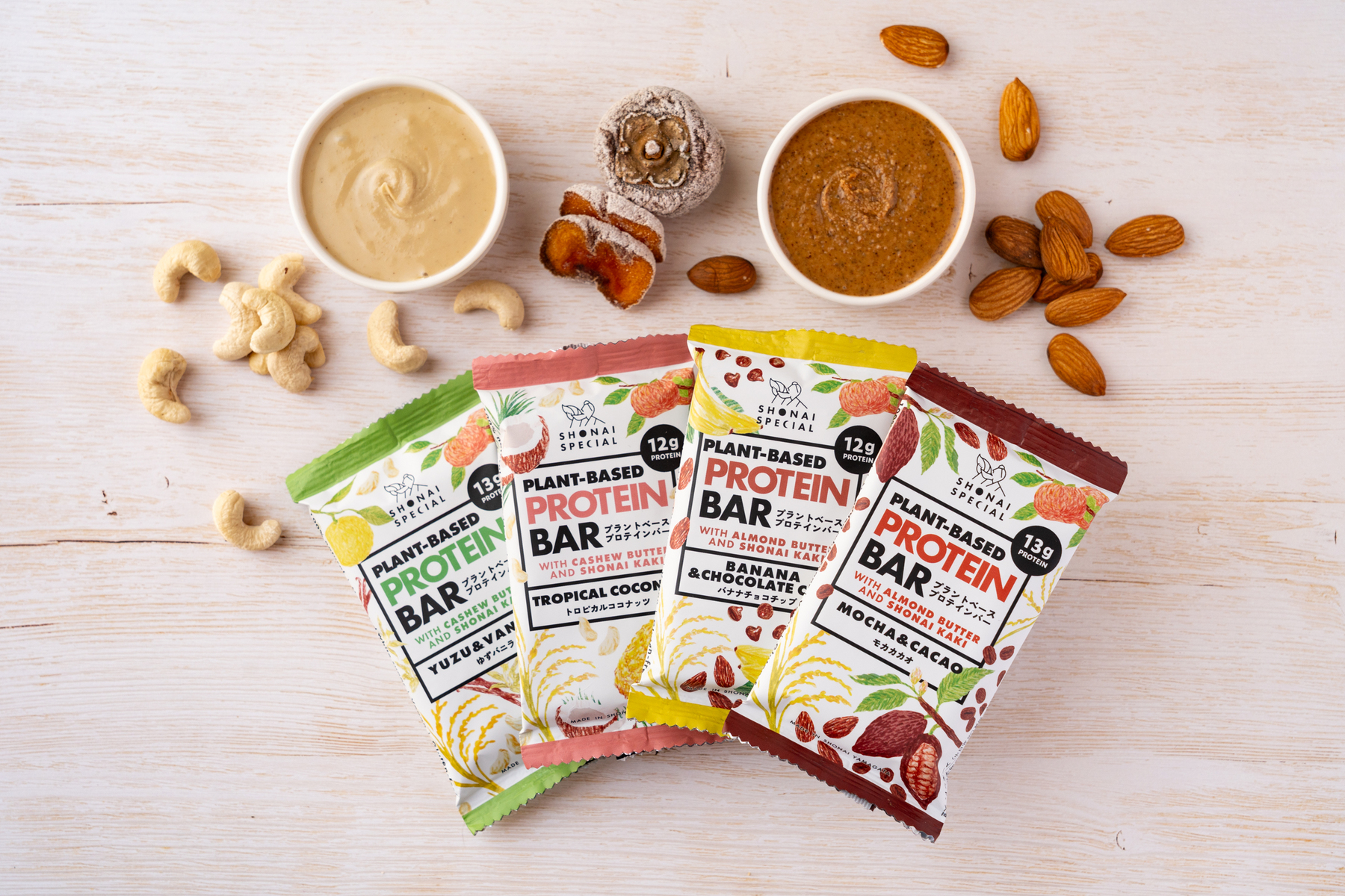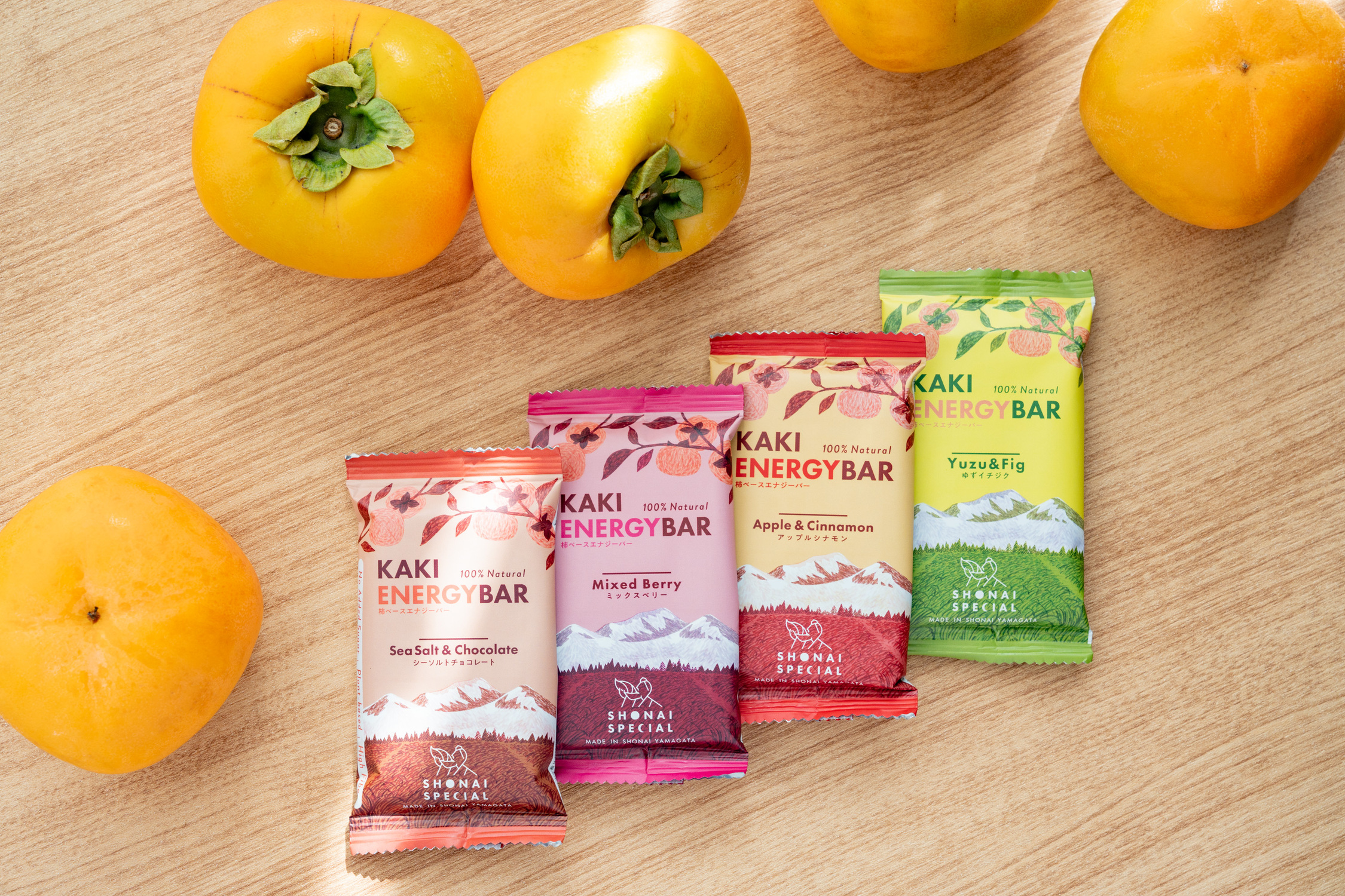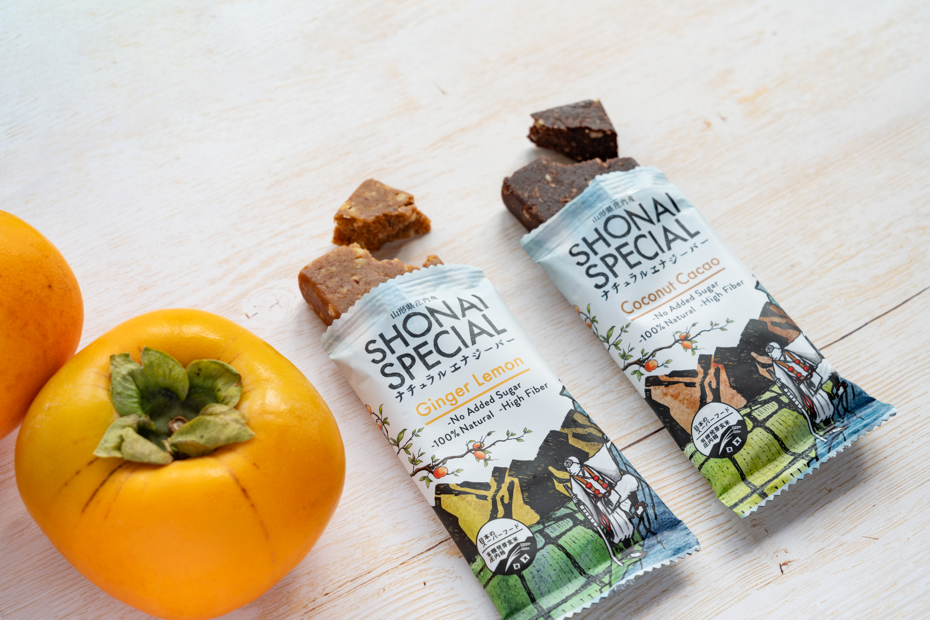 「SHONAI SPECIAL」ブランドは、庄内産の干し柿など自然素材の栄養を取れるように工夫し、着色料や香料、甘味料、砂糖、動物性素材を使わず、こだわって製造している。現在は「ナチュラルエナジーバー」、「柿ベースエナジーバー」、「プラントベースプロテインバー」の3種類をラインナップ。