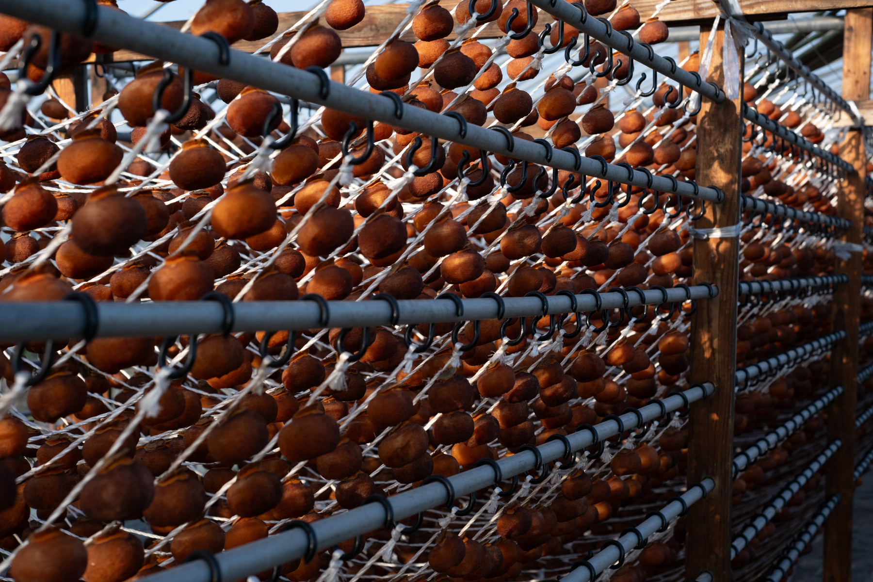 きれいに並べて干された庄内柿たち。オレンジ色が鮮やかだ。