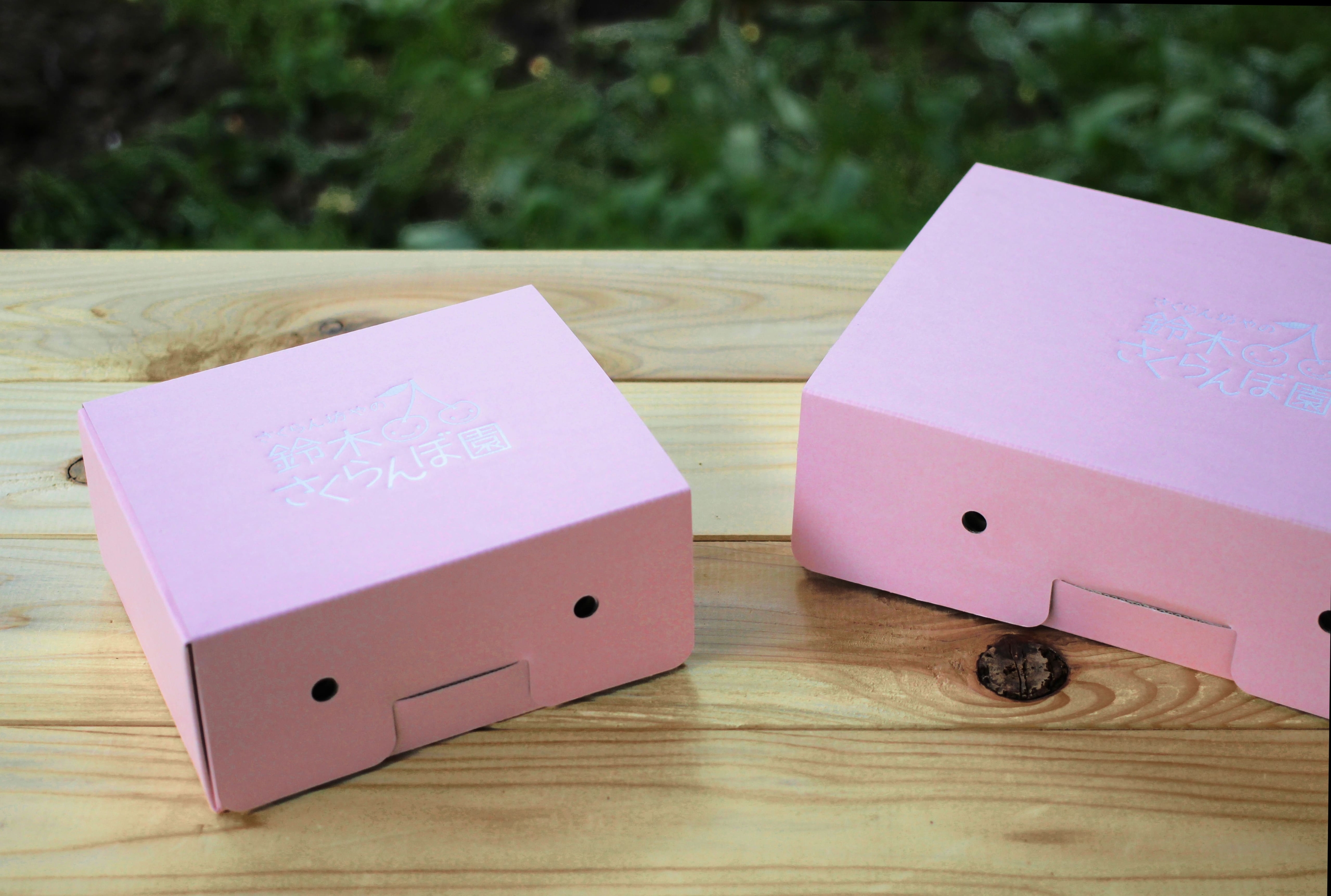 さくらんぼのギフト用パッケージ。高級感の中にも可愛らしさを色で表現。中に入っているさくらんぼを予感させるデザインに仕上げた。